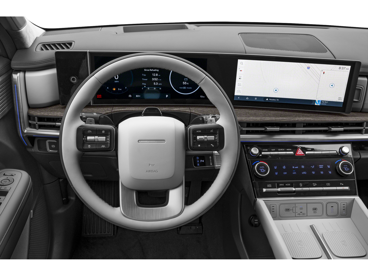 - Radio: AM/FM/HD Bose Premium Audio System -inc: 12 speakers including subwoofer, external amplifier, 12.3" wide touchscreen, Apple CarPlay and Android Auto, Bluetooth hands-free w/wireless audio streaming, dynamic voice recognition, USB connectivity, SiriusXM, Blue Link+ connected car system, over-the-air updating capability, navigation system including traffic flow w/incident data via HD Radio (HERE) and rear seat quiet mode